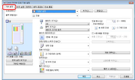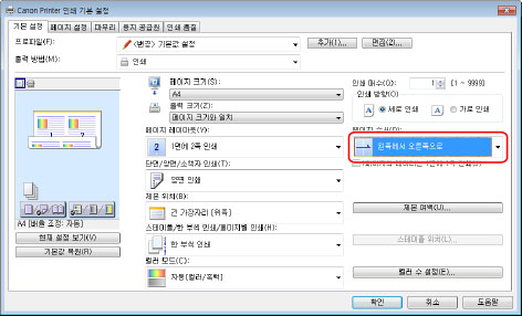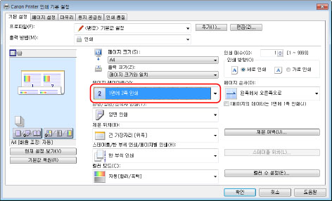 [페이지 설정] 탭에서 이 기능을 구성할 수도 있습니다. 이 기능을 사용할 때, [수동 배율 조정]을 선택할 수 없으며 크기를 지정하여 확대/축소할 수 없습니다. 사용 중인 응용 프로그램에 따라 여러 사본을 인쇄할 수 있는 기능이 있지만 해당 기능을 이 기능과 함께 사용하지 마십시오. 이렇게 할 경우 올바르게 인쇄되지 않을 수도 있습니다. 화면은 운영 체제와 프린터 드라이버의 종류 및 버전에 따라 다를 수 있습니다. |