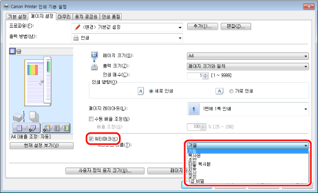 이미 제공된 워터마크 이외에 최대 50개 워터마크를 등록할 수 있습니다. 화면은 운영 체제와 프린터 드라이버의 종류 및 버전에 따라 다를 수 있습니다. |