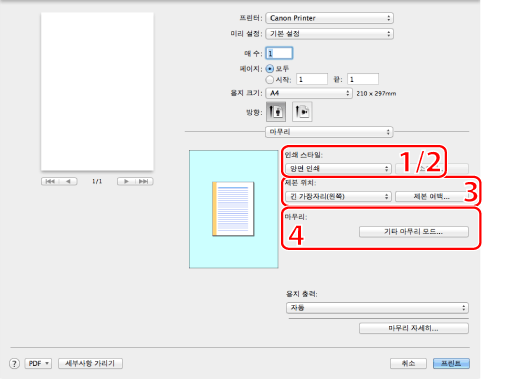 3. 제본 위치/중앙여백 | 중앙여백의 방향과 폭을 설정합니다. | 4. 마무리 | 배지 트레이의 배지 방식을 지정합니다. |