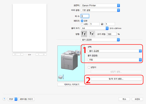 1. 급지 위치 | 특정 유형의 용지에 인쇄하려는 경우에는 용지가 들어 있는 급지 위치 또는 용지 종류를 지정합니다. | 2. 앞표지/뒷표지 | 본문 복사에 사용되는 용지와는 다른 용지를 앞표지와 뒷표지용으로 사용합니다. |