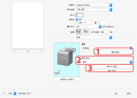 1. 품질 설정 | 인쇄 품질에 관한 설정을 제어할 수 있습니다. | 2. 흑백 인쇄 | 컬러 문서를 흑백으로 인쇄합니다("인쇄용 컬러 모드 설정" 참고). |