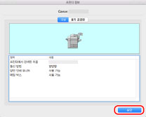 [프린터 정보] 대화상자 맨 위에 표시된 프린터 드라이버 이름과 [프린터에서 검색된 이름]으로 표시된 프린터 이름이 서로 일치하지 않으면 프린터 기능을 제대로 사용하지 못할 수도 있습니다. 이름이 일치하지 않을 경우 [시스템 환경설정]에 추가한 프린터를 삭제했다가 다시 추가하십시오. 자세한 내용은 프린터 드라이버 설명서를 참고하십시오("설치" 참고). 화면은 운영 체제, 응용 프로그램과 프린터 드라이버의 종류 및 버전에 따라 다를 수 있습니다. |