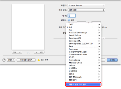 필요한 용지 크기가 [용지 크기]에 표시되지 않는 경우, 새 용지 크기를 등록할 수 있습니다.