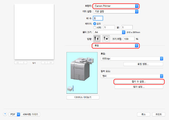사용 중인 프린터를 선택하고 → [품질]을 선택한 다음 → [컬러 수 설정]을 클릭합니다.
