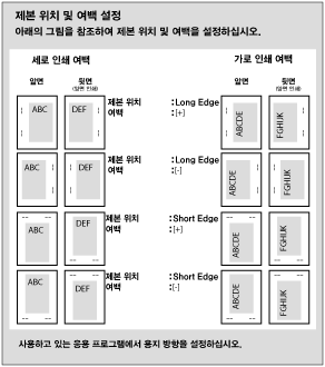 이 설정을 사용하여 제본 위치를 용지의 Long Edge(긴 가장자리) 또는 Short Edge(짧은 가장자리)로 설정할지 여부를 결정합니다. 양면 인쇄물을 제본하는 경우 이미지 방향이 올바른 레이아웃이 되도록 자동으로 조정됩니다.