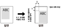설정값을 증가시키면 용지에서 오른쪽 X 방향으로 이미지가 이동합니다. 설정값을 감소시키면 이미지가 용지에서 왼쪽 X 방향으로 이동합니다.
