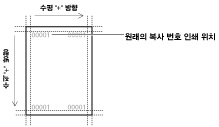 'Finishing(마무리)' 모드를 [Rotate+Group], [Offset+Group] 또는 [Staple+Group]으로 지정한 경우 [Rotate+Collate], [Offset+Collate] 또는 [Staple+Collate]가 지정됩니다. 인쇄 가능 영역 밖으로 부수 번호 자릿수가 배치되도록 인쇄 위치를 조정할 경우에는 인쇄 가능 영역 밖의 부분은 인쇄되지 않습니다. |