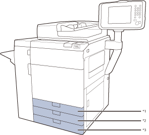 다음 그림은 용지가 걸린 위치를 나타냅니다. 이를 참고하여 걸린 용지를 제거하십시오. *1 C-용지 카세트 1 *2 C-용지 카세트 2 *3 C-용지 카세트 3 |