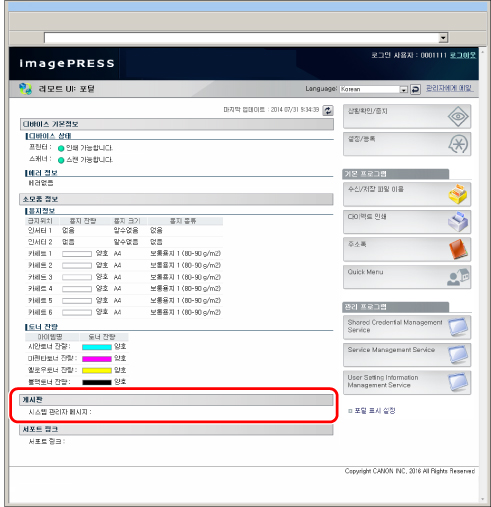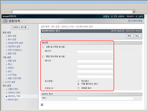 메시지: | 터치 패널 화면 또는 리모트 UI의 포털 페이지에 표시된 메시지를 팝업창으로 입력하십시오. 한 줄에 최대 23자까지 입력할 수 있으며 메시지 입력에 네 줄을 이용할 수 있습니다. |