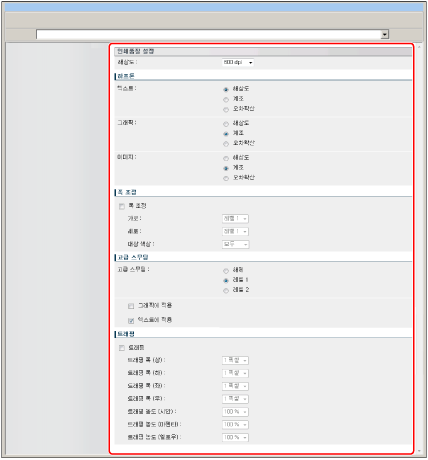 [폭 조정] | 이 설정은 자폭 또는 선폭의 조정 여부를 지정합니다. [세로] 및 [가로] 폭을 지정할 수 있습니다. [레벨 2] 결과가 [레벨 1]보다 넓습니다. [레벨 1]를 이용하여 알맞은 결과를 얻을 수 없는 경우 [레벨 2]를 선택합니다. [대상 색상]에서 [모두] 또는 [흑색만]을 선택하여 자폭 또는 선폭의 모든 색 또는 흑색만 조정할지 여부를 지정할 수 있습니다. 이 설정은 [트래핑]과 같이 사용할 수 없습니다. |