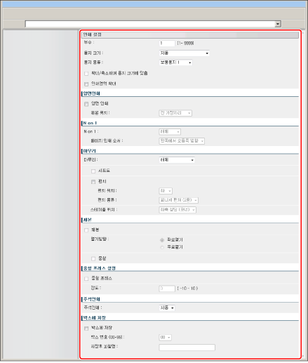 [펀치]* | 이 설정은 인쇄된 용지에 구멍을 만들 수 있도록 합니다. 확인란과 <펀치 위치>의 [좌], [우], [상], 또는 [하] 중 하나를 선택합니다. <펀치 종류>의 경우 사용하는 펀처 유닛의 종류를 선택합니다. 스테이플과 펀치 설정을 모두 선택한 경우 위치가 맞도록 펀치와 스테이플 설정을 지정합니다. 위치가 맞지 않는 경우(예를 들어, 스테이플 위치는 우측에 있고 펀치 위치는 좌측에 있음) 두 설정값은 무효한 것이며 스테이플 또는 펀치를 수행하지 않아도 용지가 인쇄됩니다. 펀치할 구멍 수는 장착된 피니셔의 펀처 유닛 유형에 따라 다릅니다. |