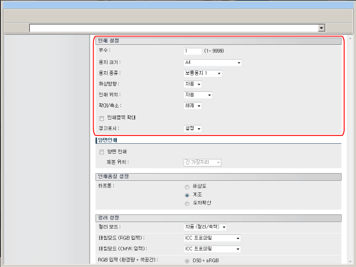 기본 설정을 복원하려면 [기본값으로 복구]를 클릭합니다. 파일이 전송될 때 [인쇄 시작]을 반복해서 클릭하지 마십시오. 파일을 전송하는 데 약간의 시간이 소요됩니다. 그러나, 전송 중 반복해서 클릭할 경우 파일이 손상되거나 전송이 되지 않을 수 있습니다. |