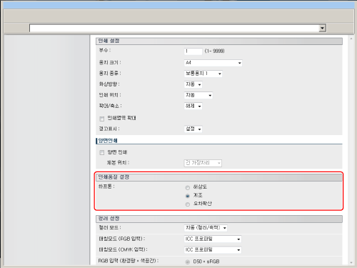 [출력 프로파일] | 이 설정을 사용하여 인쇄할 데이터에 적합한 프로파일을 정의할 수 있습니다. 이 설정은 인쇄 작업중인 모든 데이터에 적용되므로 선택한 프로파일이 인쇄 작업에 적합한 지 확인하십시오. [보통] 이 설정은 모니터에 나타나는 컬러에 가까운 컬러를 인쇄합니다. [사진] 이 설정은 사진 인화에 가까운 컬러를 인쇄합니다. [TR Normal] 이 설정은 모니터에 나타나는 컬러에 가까운 컬러를 인쇄하며 텍스트 및 가는 선에 대한 토너 사용을 줄입니다. [TR Photo] 이 설정은 사진 인화에 가까운 컬러를 인쇄하며 텍스트 및 가는 선에 대한 토너 사용을 줄입니다. [다운로드 프로파일] 이 설정은 iW Management Console을 사용하여 호스트 컴퓨터에서 이 기기로 다운로드 한 사용자 정의 시뮬레이션 대상을 사용합니다. |