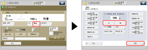 [배율]을 누르고 → [-]와 [+]를 사용하여 줌 배율을 조정한 후 → [확인]을 누릅니다.