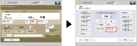 기기가 입력한 값에 따라 정확한 배율(줌)을 자동으로 계산합니다. 하지만 원고 이미지가 용지 크기에 따라 조금 잘릴 수도 있습니다.