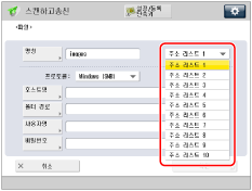 [표시언어/키보드 전환 설정/해제]를 '설정'으로 지정하면 파일 서버 수신인의 호스트 이름 및 폴더 경로가 올바르게 나타나지 않을 수도 있으며 검색되지 않을 수도 있습니다. ("표시 언어/키보드 전환 설정" 참고) |