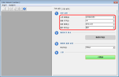 스캔 전에 디바이스 제어판에서 스캐너를 온라인으로 설정해야 합니다("스캐너를 온라인/오프라인으로 전환" 참고). 운영 체제의 WIA-TWAIN 호환성 모드로 Color Network ScanGear 2 드라이버를 사용하면 운영 체제의 기존 UI가 표시되고 절차가 달라집니다. |