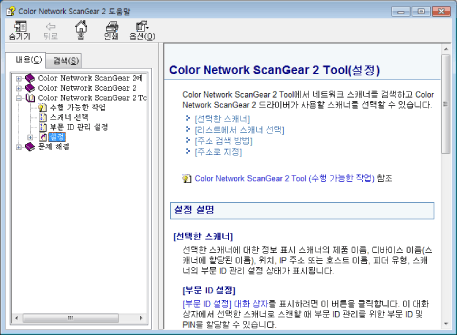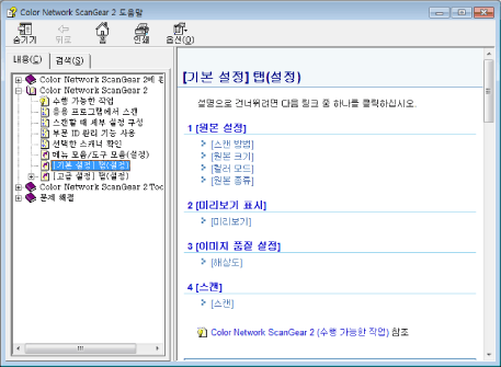 도구 모음에서 [도움말] → [Color Network ScanGear 2 도움말]을 클릭합니다.
