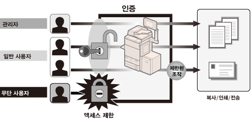 관리자는 인증 모드를 사용하여 일반 사용자의 액세스를 제한하고 작업에 대한 제한을 설정함으로써 사용자를 관리합니다. 일반 사용자 권한은 사용자별로 설정할 수 있습니다. 관리자는 무단 사용자의 액세스를 방지함으로써 기기 변경 및 정보 누출 위험을 줄일 수 있습니다.