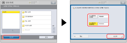 [시스템 관리 자 PIN 번호]: | [시스템 관리자 PIN 번호] → [PIN 번호] → - (숫자키)를 사용하여 시스템 비밀번호로 숫자(7자리까지)를 입력합니다. [확인입력]을 누르고 → 동일한 번호를 입력하여 비밀번호를 확인한 후 → [확인]을 누릅니다.7자리보다 작게 입력하더라도 숫자의 시작에 0이 추가되고 7자리 숫자가 설정됩니다. 하지만, 숫자의 시작에 0은 로그인 시 생략할 수 있습니다. 예를 들어 <2>, <02> 또는 <002>를 입력하더라도 비밀번호는 <0000002>로 설정됩니다. 그러나 <2>, <02> 또는 <002>를 입력하여 로그인 할 수 있습니다. <0>이나 <00>과 같이 숫자 0만 있는 시스템 관리자 ID 또는 시스템 비밀번호는 등록할 수 없습니다. |