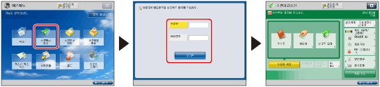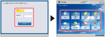 "기동/복구후 표시화면"에 명시된 화면이 구동/복원 후 표시되는 기본 화면으로 표시됩니다. 사용이 제한된 기능을 선택하면 로그인 화면이 표시됩니다. 부문 ID와 PIN 번호를 입력하여 각각의 기능을 사용합니다.