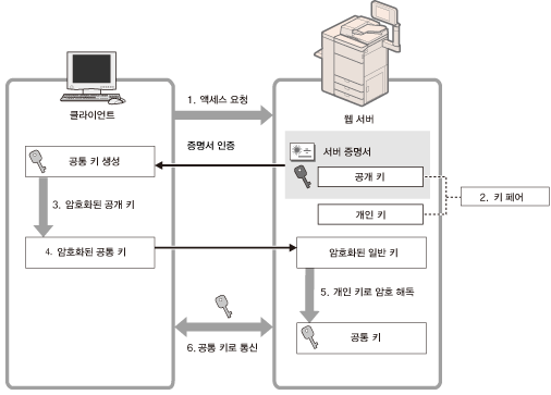 1. | 사용자가 컴퓨터에서 기기에 액세스할 때 TLS용 서버 인증서와 서버용 공개 키를 요청합니다. |