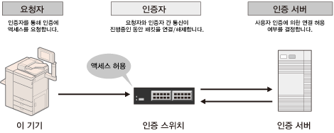 인증 서버(RADIUS: Remote Authentication Dial In User Service)를 통해 모든 인증 정보를 관리하고 요청자를 인증합니다. RADIUS 서버에서 인증된 요청자만 인증자에 의해 네트워크에 연결할 수 있는 권한을 가지고 있으므로 무단 액세스를 방지할 수 있습니다.