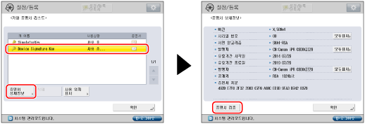 "Device Signature Key"를 선택하고 → [증명서 상세정보] → [증명서 검증]을 누릅니다.