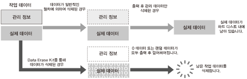 이 기기는 관리 정보 및 실제 데이터로 복사, 송신, 수신 및 인쇄 시 작업 데이터를 분리하고 저장합니다. 관리 정보는 작업이 완료될 때 자동으로 삭제되지만 실제 데이터는 하드디스크에 저장됩니다.