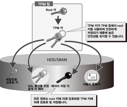 TPM 설정 모드를 사용하여 하드디스크 또는 SRAM에서 관리되는 비밀번호 및 인증서 정보를 암호화할 수 있습니다.