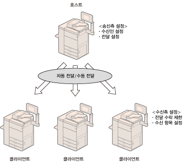 정보 수신 후 정보를 전달하고 업데이트하는 데 몇 분 정도 소요될 수도 있습니다. 작업이 완료될 때까지 기기의 주전원을 끄면 안됩니다. 그렇지 않으면 기기가 오작동할 수도 있습니다. 기기 정보는 같은 모델의 기기 사이에 공유될 수 있습니다. 단, 기기에서 사용 가능한 선택 품목 제품에 따라 일부 정보는 올바르게 전달되지 않을 수도 있습니다. <수신측 설정>의 [전달원에 의한 수신제한]을 '해제'로 설정한 경우 다른 기기 모델에서 전달된 기기 정보를 수신할 수 있습니다. ("수신 기기 설정" 참고) 하지만 일부 정보가 올바르게 전달되지 않을 수도 있습니다. 클라이언트 기기에 등록된 시스템 관리 부문 ID 및 시스템 관리 PIN 번호가 호스트 기기에 등록된 시스템 관리 부문 ID 및 시스템 관리 비밀번호와 다른 경우 디바이스 정보를 전달할 수 없습니다. |