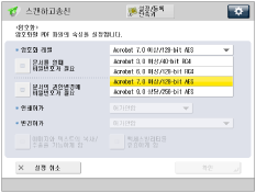 [Acrobat 10.0 상당/256-bit AES] 대신에 [Acrobat 9.0 상당/256-bit AES]를 선택하려면 아래 절차에 따라 선택 항목을 변경할 수 있습니다.