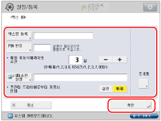 등록된 PIN 번호를 확인할 방법이 없으므로 반드시 입력한 PIN 번호를 적어 안전한 장소에 보관하십시오. 개별 박스에 대해 이러한 설정이 이전에 지정된 경우 각 박스에 대한 비밀번호 설정과 상관 없이 [기능 설정](설정/등록)의 [박스 일괄설정]에서 [파일 자동삭제까지의 시간] 및 [프린터 드라이버로부터 저장시 인쇄]를 지정할 수 있습니다. 그러나 [박스 일괄설정]을 사용한 후 별도로 각 박스의 설정을 업데이트하는 경우 업데이트된 설정은 [박스 일괄설정]으로 지정된 설정보다 우선합니다. ("박스 일괄 설정 지정" 참고) |