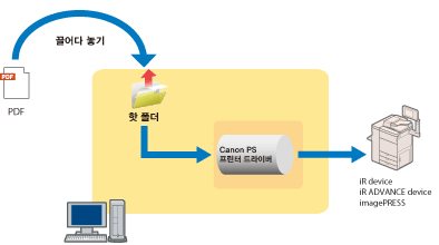 POD Hot Folder Manager는 컴퓨터에 핫 폴더로 등록된 폴더를 지속적으로 모니터링합니다. 지원되는 PDF 파일을 컴퓨터의 핫 폴더로 끌어서 놓으면 파일에 미리 설정된 인쇄 설정이 할당된 후 PS 프린터 드라이버로 전송됩니다.