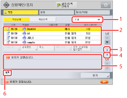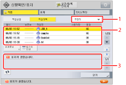 1 | 작업 종류 드롭다운 리스트 작업 종류별로 표시된 작업을 정렬할 때 누릅니다. 다음의 작업 종류를 선택합니다. 인쇄 복사 송신 송신 (팩스) 전송 저장 |