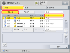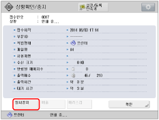 인쇄 작업을 선택하고 [상세정보]를 누른 경우 메모리에 남아 있는 인쇄 데이터를 강제로 인쇄할 때 [배출]을 누르고, 에러를 일시적으로 중단하고 인쇄를 계속할 때 [에러스킵]을 누릅니다. [배출] 및 [에러스킵]은 컴퓨터에서 전송된 인쇄 작업에만 이용할 수 있습니다. 작업이 시작될 때 지정된 용지를 사용할 수 없을 경우 알맞은 용지를 적재할 것을 묻는 메시지가 표시됩니다. 용지를 적재하고 작업을 다시 시작합니다. [기능 설정](설정/등록)에서 [작업 중단시 타임아웃]을 '설정'으로 지정한 경우 작업을 수신할 때 인쇄에 사용할 수 있는 용지가 없기 때문에 일시 중지된 작업이 지정된 시간이 경과된 후 일시 중지된 작업으로 표시됩니다. 중지된 작업의 인쇄를 재시작하려면 용지를 적재하고 → 작업을 선택하고 → [상세정보] → [재개]를 누릅니다. |