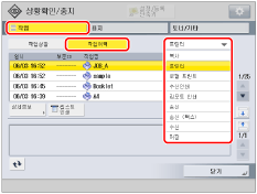 작업 이력 목록과 더불어 송신/송신(팩스) 작업에 대한 작업 상황 목록을 인쇄할 수 있습니다. 작업 상황 목록을 인쇄하려면 드롭다운 리스트에서 [송신] 또는 [송신 (팩스)]를 선택한 후 → [리스트 인쇄]를 누릅니다.