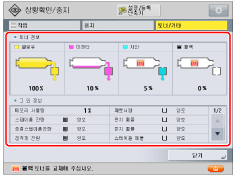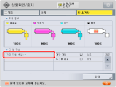 표시된 기타 소모품의 잔량과 폐 소모품 양에 대한 상세 정보는 아래와 같습니다. 표시 | 스테이플 잔량 중철 스테이플 잔량 접착제 잔량 | 양호 | 100 ~ 26% | 낮음 | 25 ~ 1% | 없음 | 0% |