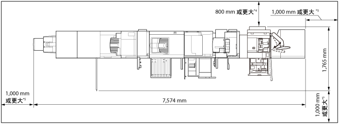 *4 關於本機器的背面,務必確保至少800 mm或以上空間以確保操作不受限制。若未安裝上圖所示的上述交付/拾取系統選購件,確保提供至少100 mm大小的空間。