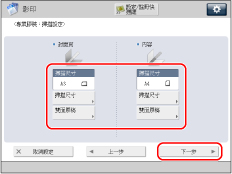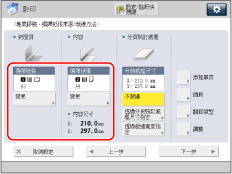 若為封面扉頁、封底扉頁或插頁設定不同的紙張尺寸,其他功能的紙張尺寸會自動變更為新紙張尺寸。但是,若將某一功能的紙張來源變更為使用相同紙張尺寸的其他紙張來源,不會變更其他功能的設定。 從「文件插頁組件-N1」輸送紙張之前,先添加紙張到「文件插頁組件-N1」中,並指定紙張尺寸。 若從「文件插頁組件-N1」送紙,請選擇[插頁器1]或[插頁器2]。若從「文件插頁組件-N1」輸送用於當前工作的紙張,請按[變更插頁器1紙張]或[變更插頁器2紙張]選擇用於插頁的紙張。 |