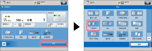 若將原稿放入送稿機,則每批原稿掃描結束後,請從原稿輸出區域取出原稿。 使用「工作建立」模式時,只能變更[變更設定]中顯示的設定。需要事先指定所需的影印設定。但是,若同時指定[N合1]和「工作建立」模式,則無法變更[濃淡度]或[選擇色彩]的設定。 可以在掃描下一批原稿之前(即批次之間)變更或指定以下設定︰份數、「雙面原稿」模式、原稿類型和影印曝光。但是,若同時指定「工作建立」模式和「影像組合」模式,則不能變更影印曝光和原稿類型。 |