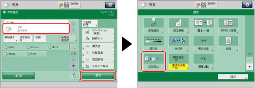 使用「工作建立」模式時,只能變更[變更設定]中顯示的設定。需要事先指定所需的掃描設定。 若將原稿放入送稿機,則每批原稿掃描結束後,請從原稿輸出區域取出原稿。 一次最多可以傳送999頁。使用[工作建立]時,若已掃描999頁原稿,則會出現一則訊息詢問是否傳送工作。若選擇傳送工作,會傳送掃描的999頁。若取消工作,就不會傳送已掃描頁。 |