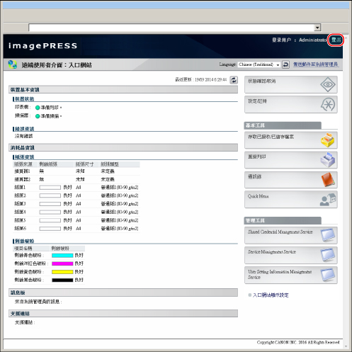 管理員和一般使用者在「設定/註冊」螢幕上的可用操作不同。 對於管理員︰ 「系統管理員」或「SSO-H系統管理員」(Administrator)可以指定本機器的所有系統設定。有關管理員類型的資訊,請參閱「管理員設定」。作為預設,本機器上設定了「系統管理員」設定(「系統管理員識別碼」/「系統PIN」)。因此,管理員必須輸入「系統管理員識別碼」和「系統PIN」才能登入。「系統管理員識別碼」和「系統PIN」的預設設定為「7654321」。建議變更「系統管理員識別碼」和「系統PIN」。有關設定「系統管理員識別碼」和「系統PIN」的詳細資訊,請參閱「指定系統管理員設定」。有關管理員權限可以使用的「設定/註冊」項目的資訊,請參閱「管理員可用設定表(觸控面板顯示螢幕)」和「管理員可用設定表(遠端使用者介面)」。 對於一般使用者︰ 可能會限制一般使用者使用「設定/註冊」螢幕的某些項目。在觸控面板顯示螢幕上,使用者不具有操作權限的項目顯示為灰色且無法選擇。在「遠端使用者介面」上不顯示使用者不具有操作權限的項目。 |