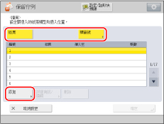 選擇設定後,可以透過按[詳細資訊/編輯]確認/變更插頁或標籤紙的設定。 要刪除插頁,選擇要刪除的設定→按[刪除]。 確保觸控面板顯示螢幕上顯示的「標籤數量」與紙張來源中添加的標籤紙的標籤數量相同。 |