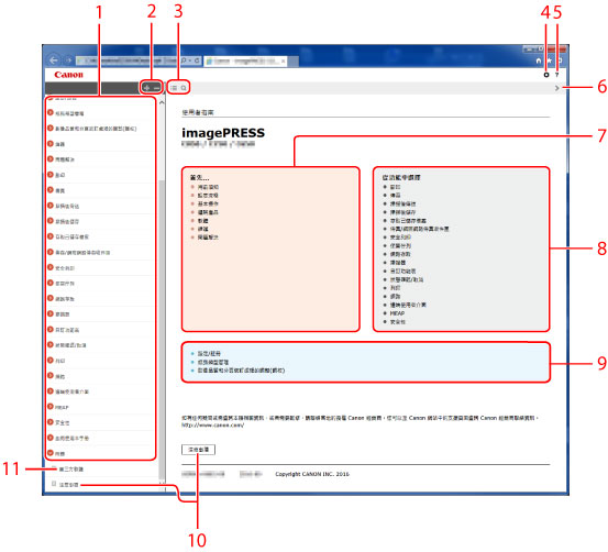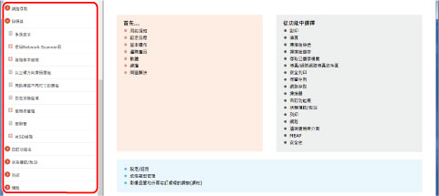1. | 目錄 顯示章節標題。按一下章節標題的 可以顯示其子項目。按一下 可以關閉本章節。若一個項目顯示[+],則按一下可以顯示其子項目。按一下[-]可以關閉該項目。 |