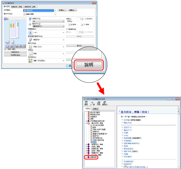以下螢幕指示如何從印表機驅動程式螢幕顯示「疑難解答」的說明。