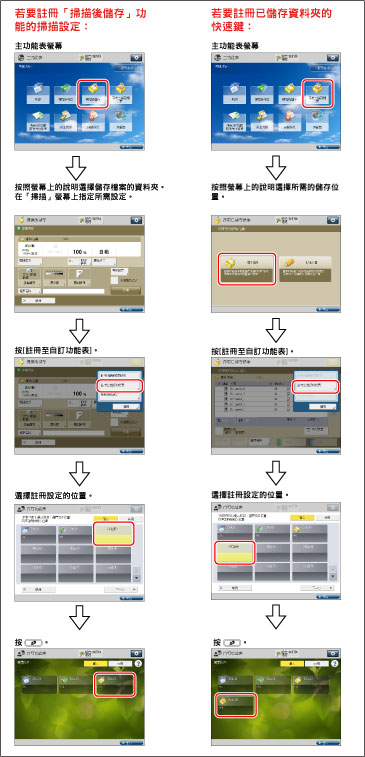 「已儲存設定」中未包括的所有[影印]和[掃描後傳送]功能設定均使用預設設定。 有關註冊「個人」按鈕/「共用」按鈕的說明,請參閱「註冊個人按鈕/共用按鈕」中以「掃描後傳送」功能為例的說明。 有關使用「影印」、「掃描後傳送」、「傳真」和「掃描後儲存」功能所需選購產品的資訊,請參閱「每種功能所需的選購產品」。 |