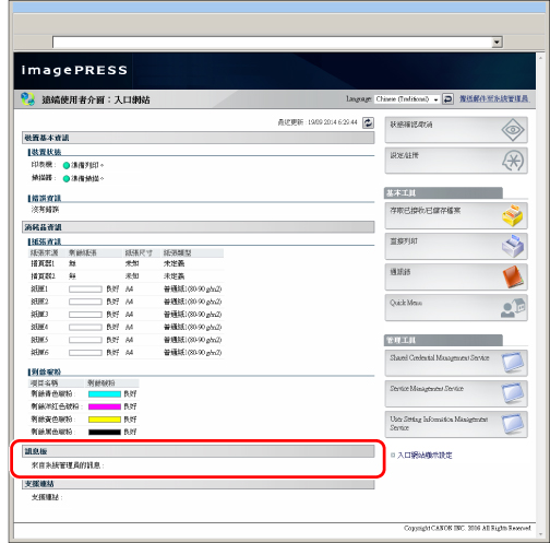 啟用快顯視窗: | 選擇此項會在觸控面板顯示螢幕上以快顯視窗形式顯示訊息板。 若選擇[在入口網站上顯示],則會在「遠端使用者介面」的入口網站頁面上顯示訊息板。 |