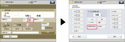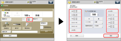 利用該模式,可以透過分別輸入原稿尺寸和輸出紙張尺寸來放大或縮小原稿。原稿放置在原稿台玻璃上時,影印(縮放)倍率的設定範圍為25%至400%;原稿放入送稿機時,影印(縮放)倍率的設定範圍為25%至200%。