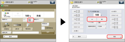 按[影印倍率]→使用[-]和[+]調整縮放倍率→按[確定]。